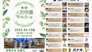 イベント 【第4回】荘厳社 人形供養マルシェ 開催!🌸 【第4回】荘厳社 人形供養マルシェ開催!感謝を伝える一日を楽しむイベント大切にしてきたお人形に感謝を伝える「人形供養」と、地域の美味しいもの・素敵なものが集まる「マルシェ」が同時開催される「第4回 荘厳社 人形供養マルシェ」の開催が決定しま... 2026.04.09 イベント